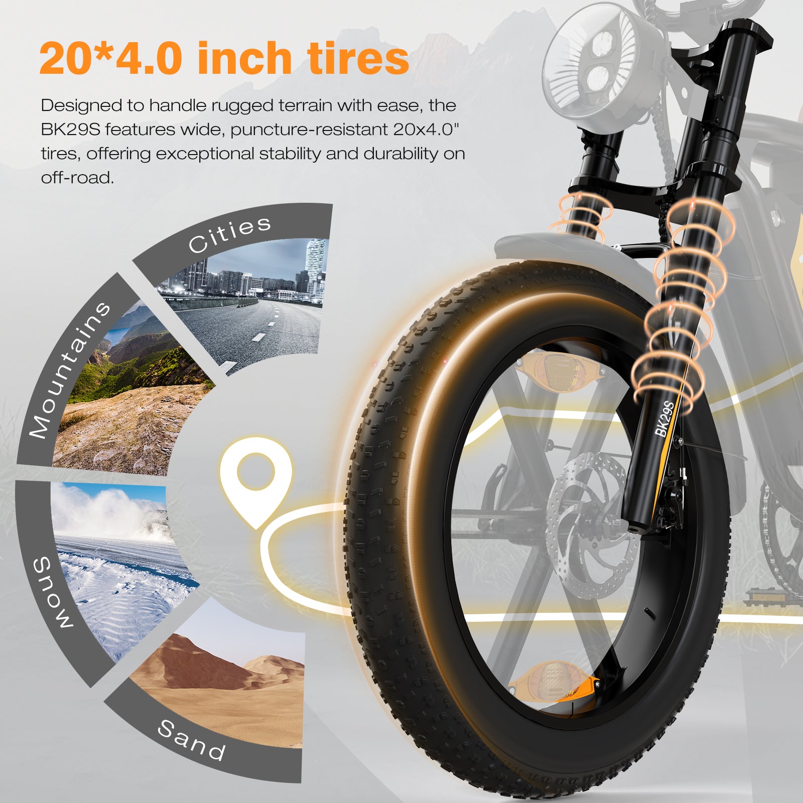 Erobern Sie jedes Gelände mit dem leistungsstarken 250-W-Motor und zwei 48-V-13-Ah-Akkus. Das BK29S verfügt über robuste 20x4.0" Dicke Reifen, stylischer Offroad-Look und ein smartes Display für das ultimative Fahrerlebnis.