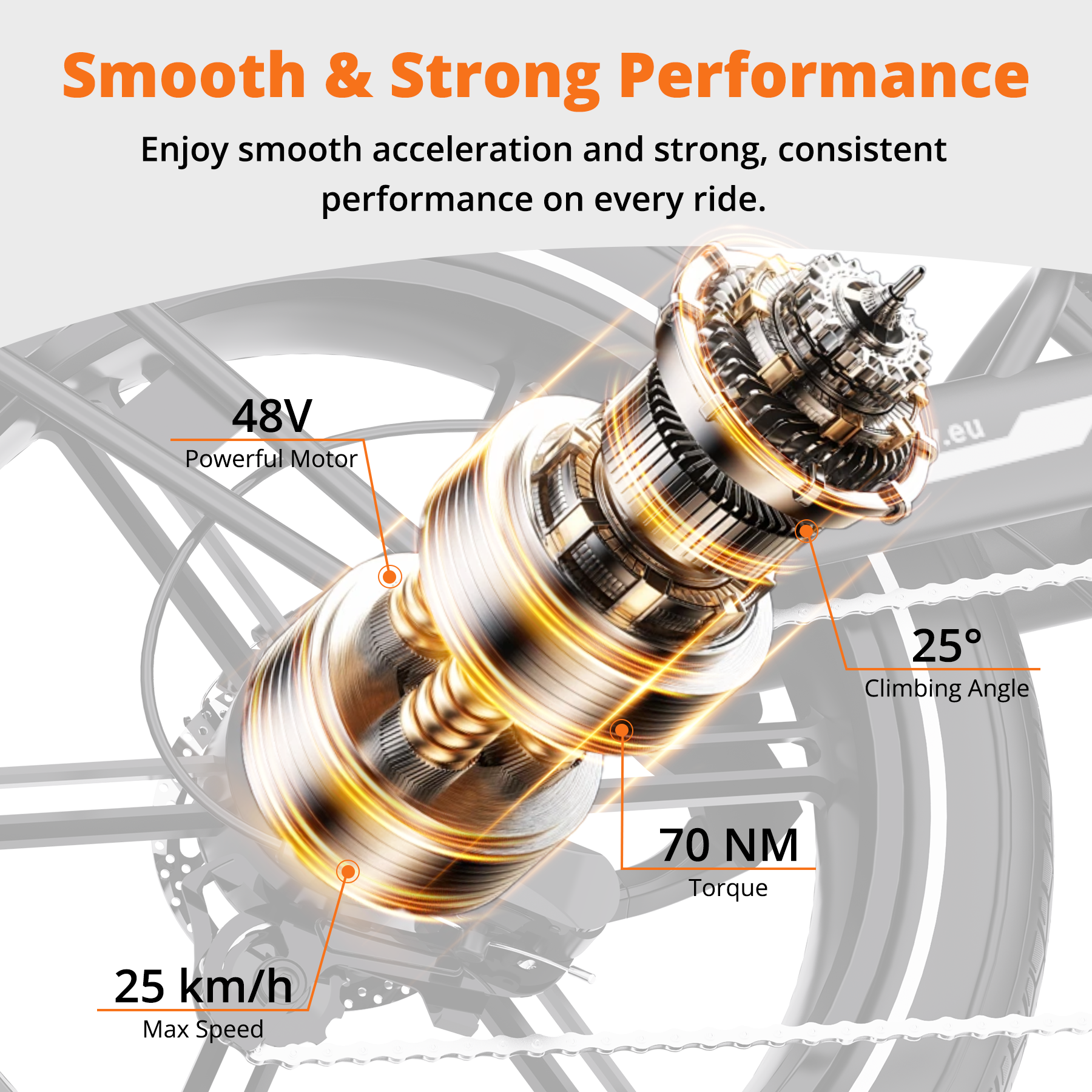Ausgestattet mit einem bürstenlosen 250-W-Nabenmotor, der ein Drehmoment von 70 Nm liefert, bewältigt das BK30 mühelos Steigungen bis zu 25°. Laufruhig, effizient und zuverlässig – perfekt für den Stadtverkehr, anspruchsvolle Trails und lange Touren. Der integrierte Schubhebel mit 6 km/h unterstützt müheloses Anfahren und ermöglicht die problemlose Bewältigung von schwierigem Gelände.