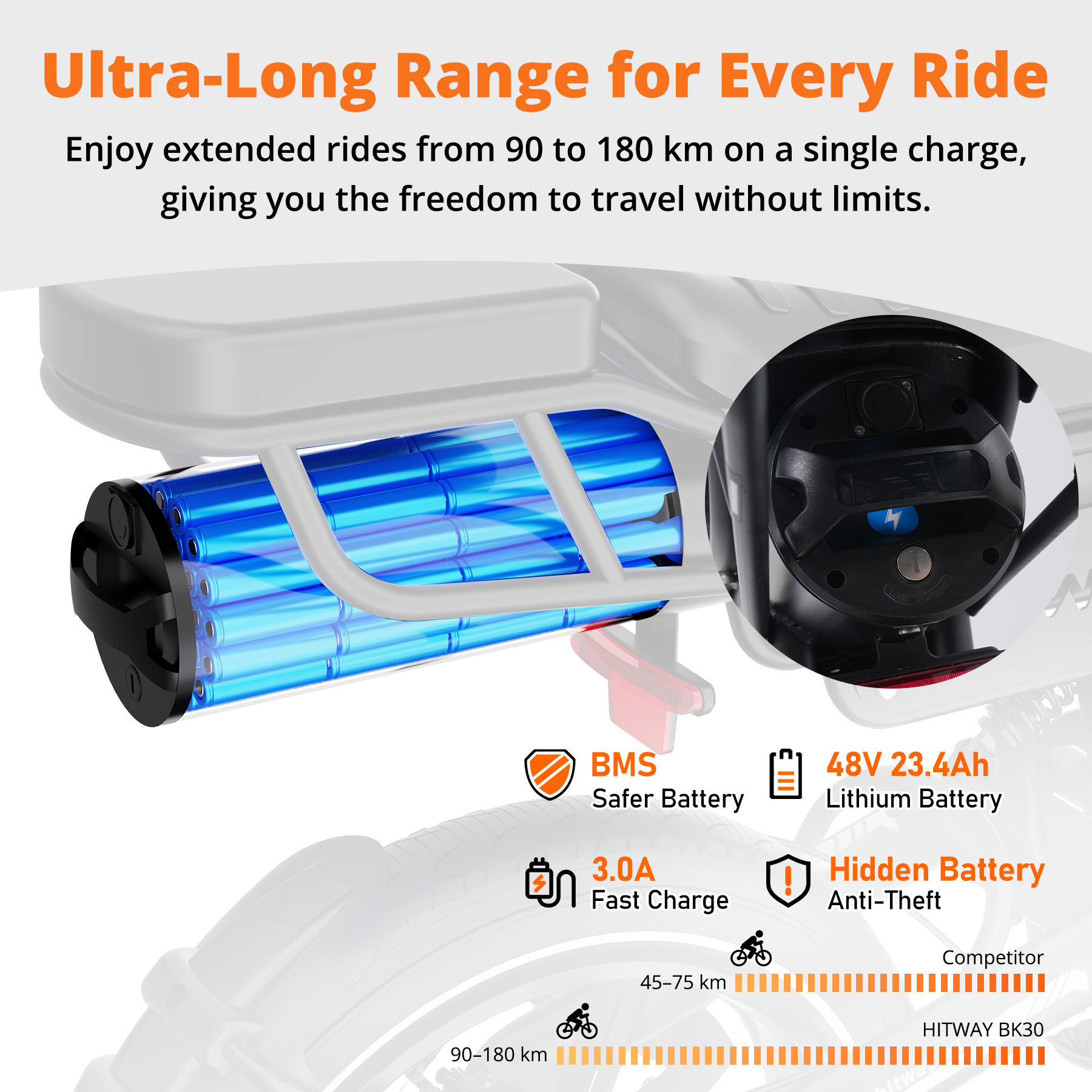 The BK30 electric bike is equipped with a high-capacity 48V 23.4Ah (1123.2Wh) lithium battery, delivering an impressive range of 90–180 km per charge. Its hidden, removable design not only makes charging convenient but also adds enhanced anti-theft protection for peace of mind on every ride.