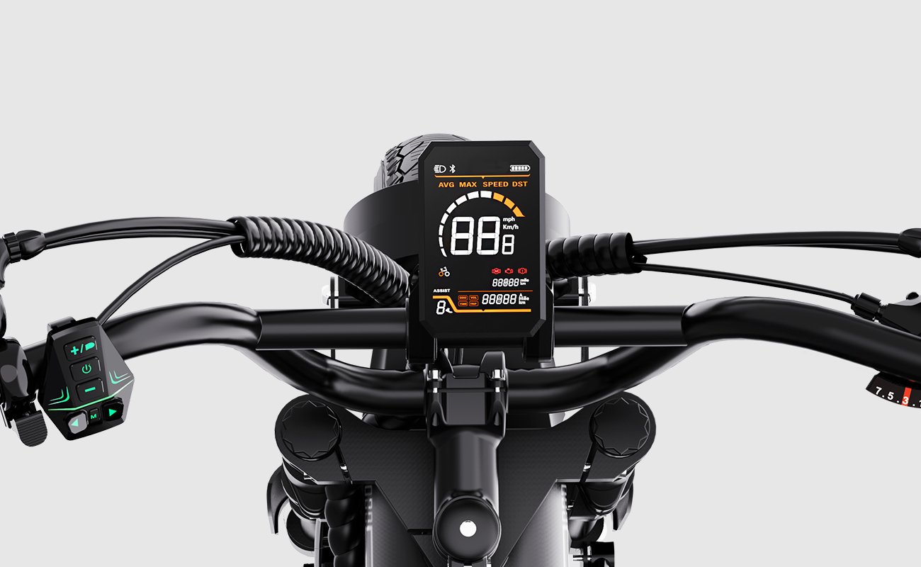 Positioned at the centre of the handlebar, the smart display shows key riding data at a glance. You can easily control the lights and adjust pedal-assist levels directly from the dashboard for a smoother, smarter ride.
