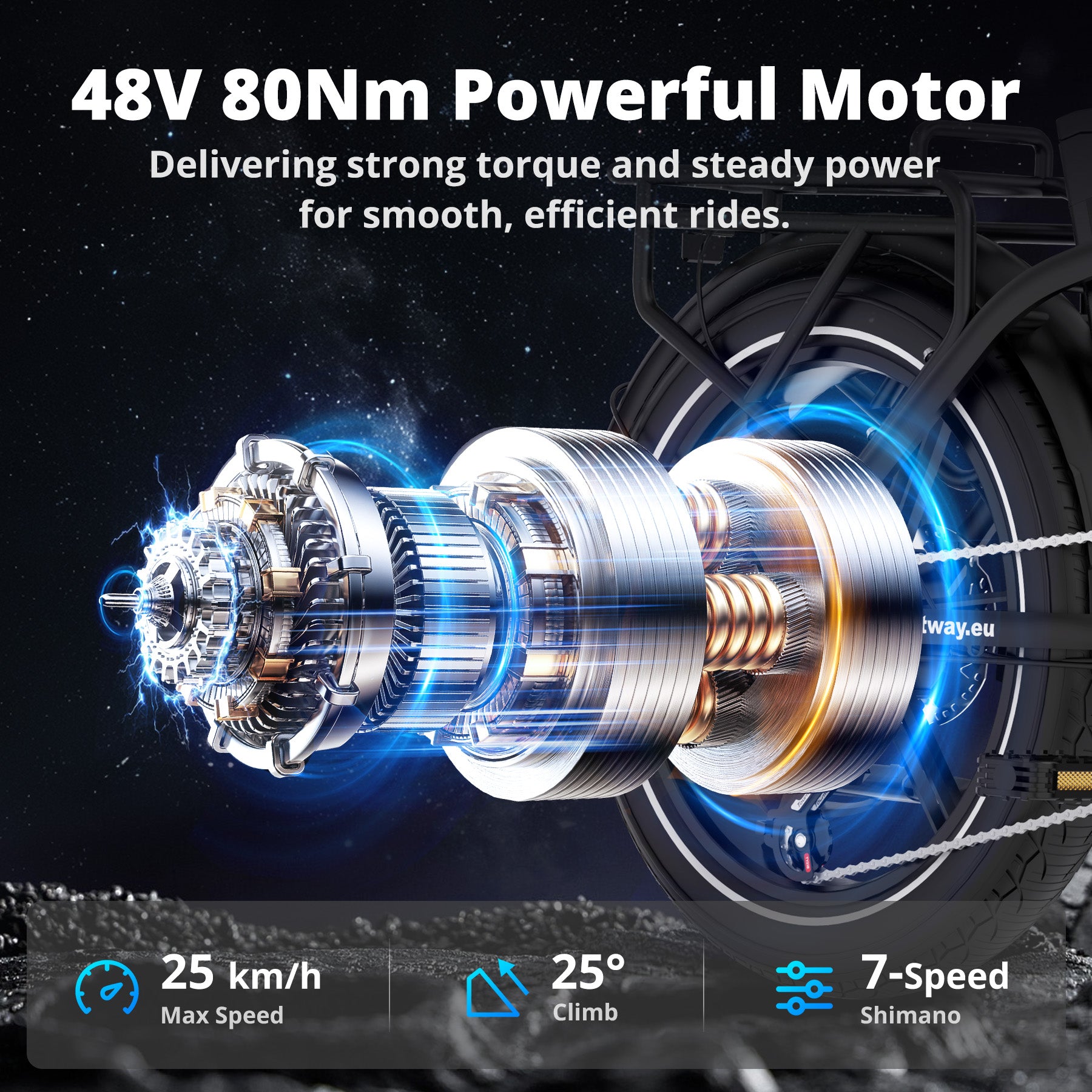 Equipped with a high-torque 48V motor delivering 80Nm, this ebike ensures smooth acceleration, stable power output, and effortless climbing up to 25°. Combined with a 25 km/h riding speed and a reliable Shimano 7-speed drivetrain, it offers an efficient and enjoyable ride across city streets and varied terrain.