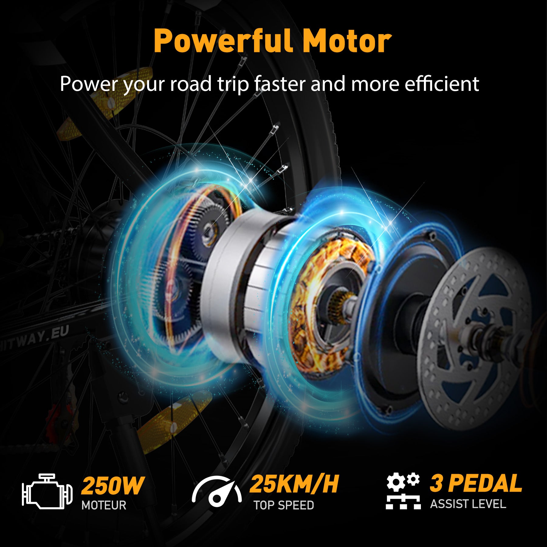 The 250W motor provides smooth and efficient power, fully compliant with EU regulations for electric bikes. Equipped with a 3-level Pedal Assist System (PAS), it lets you choose your speed based on your needs: PAS 1 offers a gentle 15 km/h, PAS 2 reaches a comfortable 20 km/h, and PAS 3 accelerates to the top speed of 25 km/h. This range of assistance levels supports versatile riding, whether for relaxed commutes or a quicker pace on open roads.
