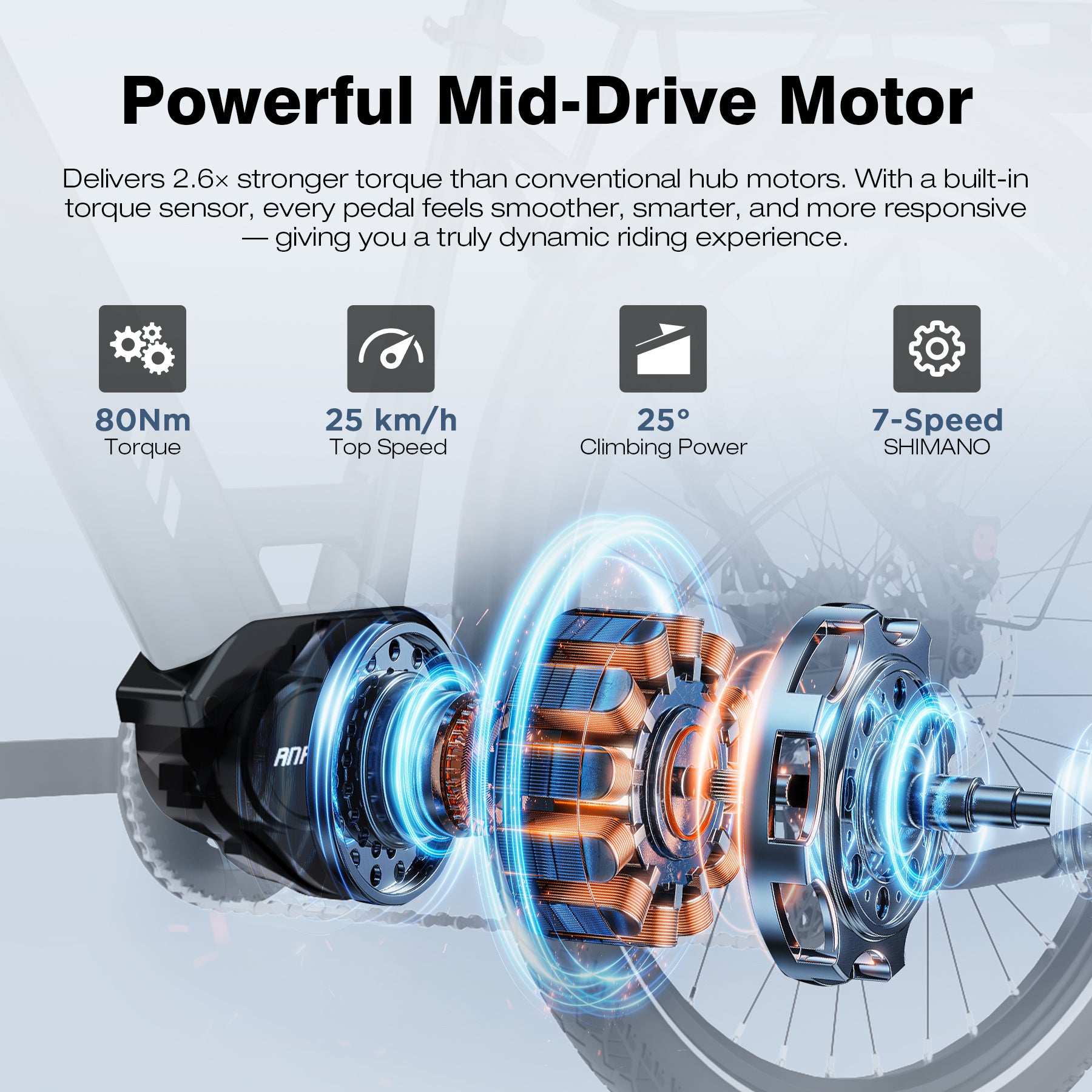 Experience superior balance and control with the ANNADA mid-drive motor, delivering an impressive 80Nm of torque — 2.6× stronger than typical hub motors. By positioning the motor at the bike’s centre, power is distributed evenly for better stability and traction. Combined with a torque sensor, the BK32 intelligently adjusts motor output based on your pedalling force, offering smoother acceleration and a truly natural riding feel.