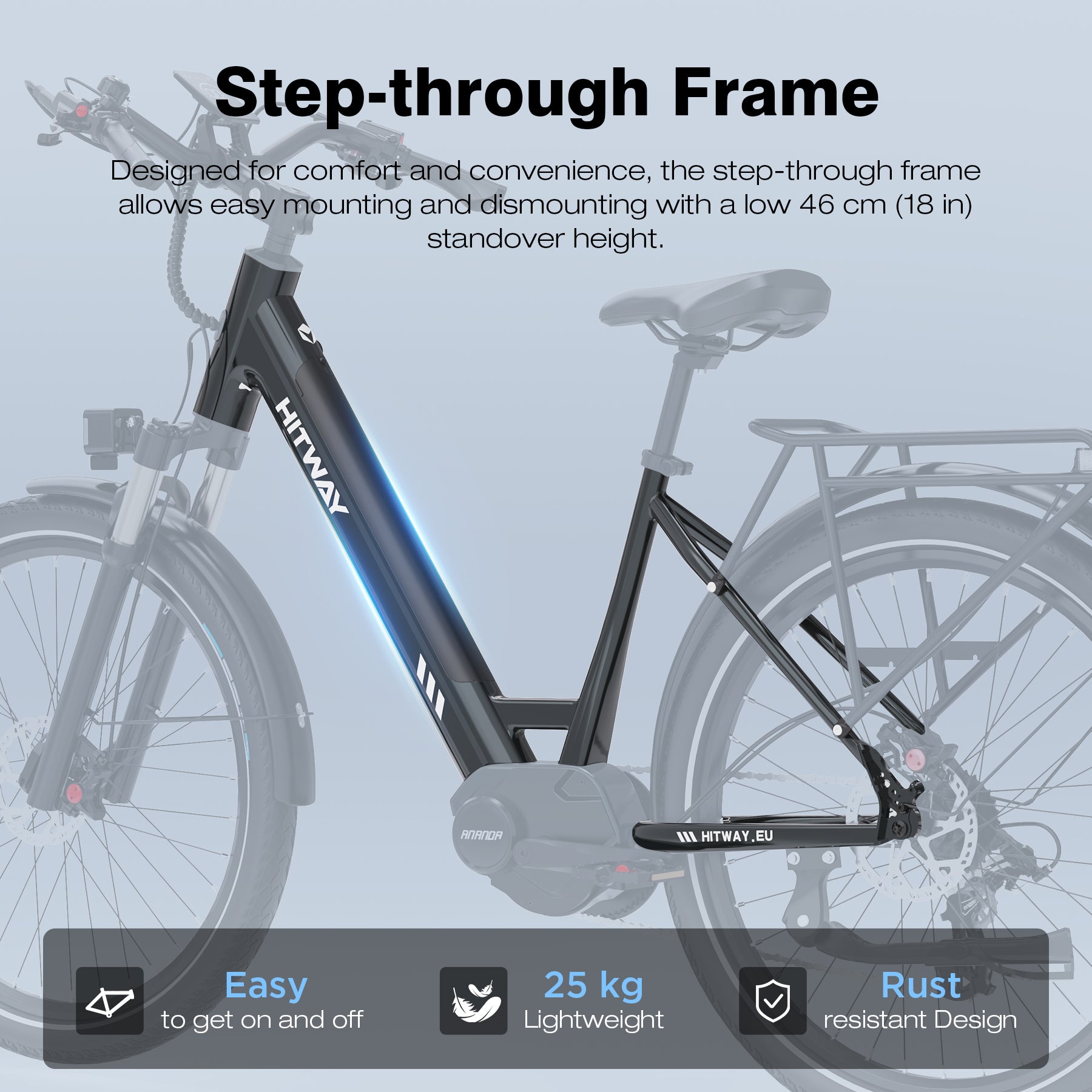 Designed for everyday use, the step-through frame makes mounting effortless for all riders. Equipped with front and rear lights, a rear cargo rack, and 7-speed Shimano gearing, the BK32 blends style, comfort, and functionality — making it a top choice for anyone seeking a premium yet affordable mid-drive e-bike.