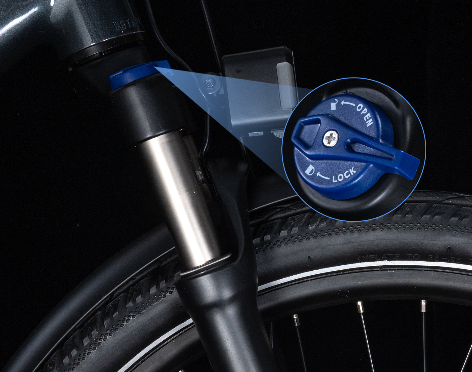 Enjoy unmatched comfort with a lockable front suspension fork that absorbs shocks from bumps, gravel, and uneven roads. Whether you’re cruising on city streets or exploring countryside paths, the BK32 delivers a smooth, stable, and fatigue-free ride. Simply lock the fork when riding on flat surfaces to maximise pedalling efficiency.