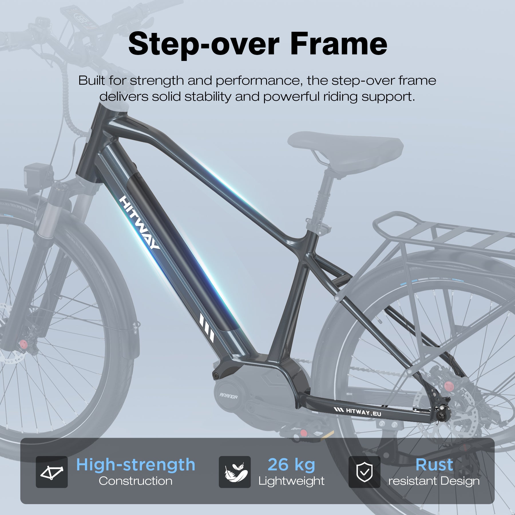 The BK33 features a step-over frame for a sporty and sturdy design, combined with a built-in seat suspension for extra comfort on longer rides. Weighing 26 kg, it balances stability and ease of handling, making it perfect for urban commuting and leisure rides.