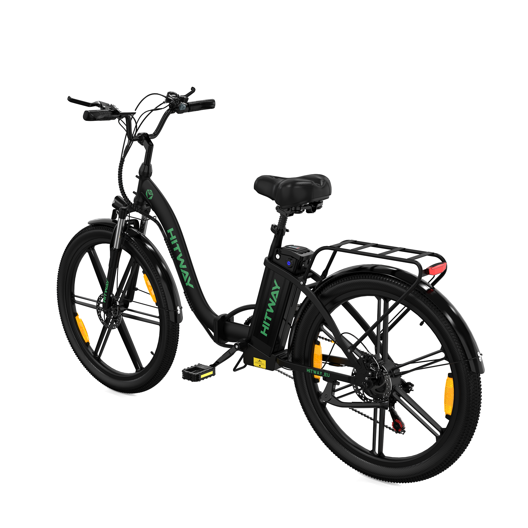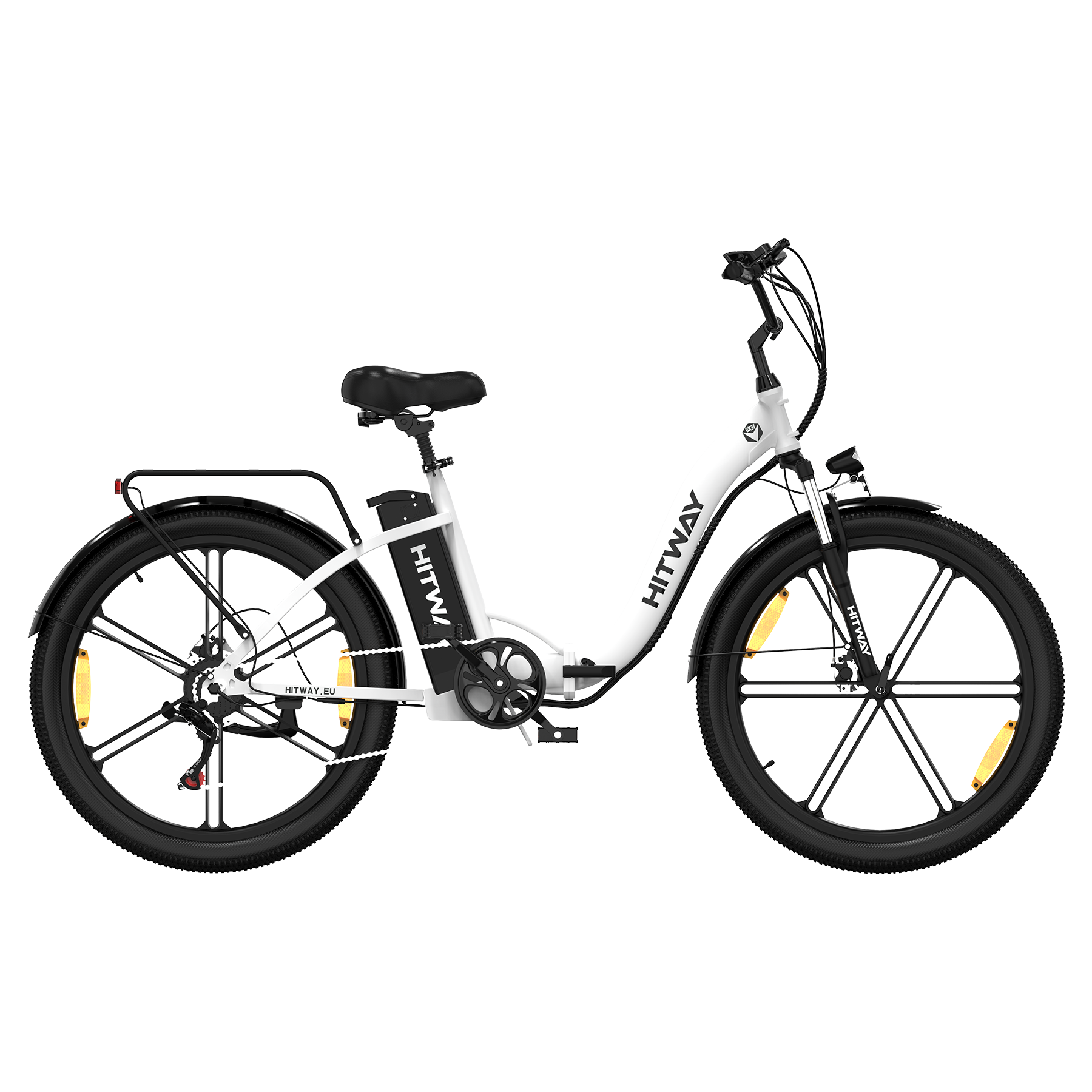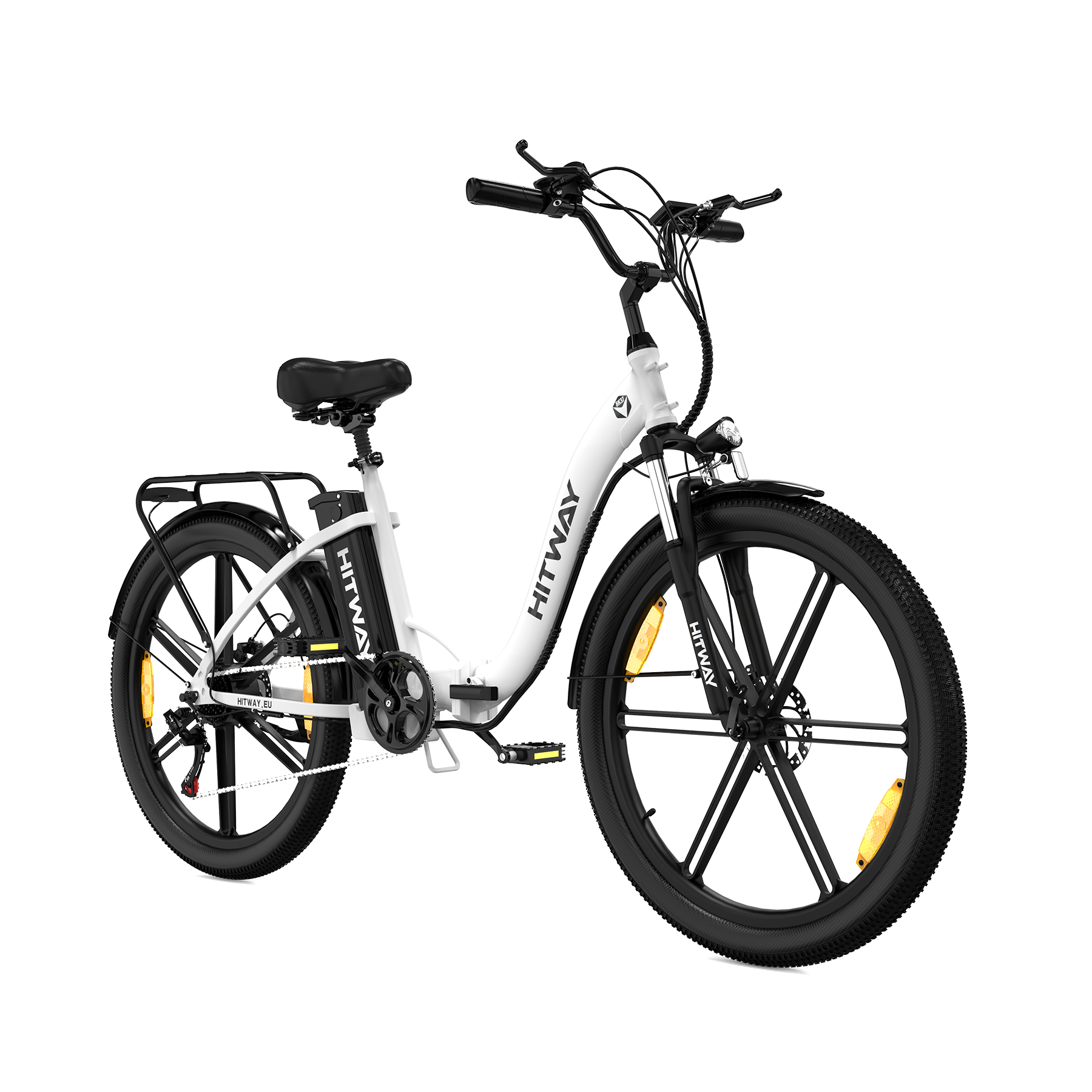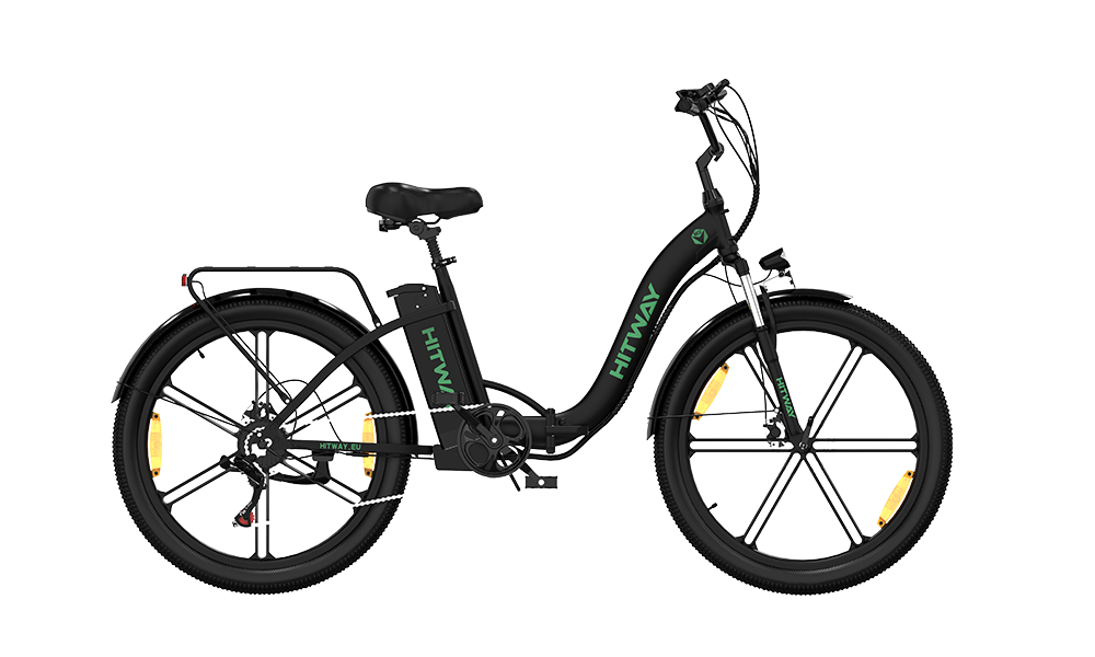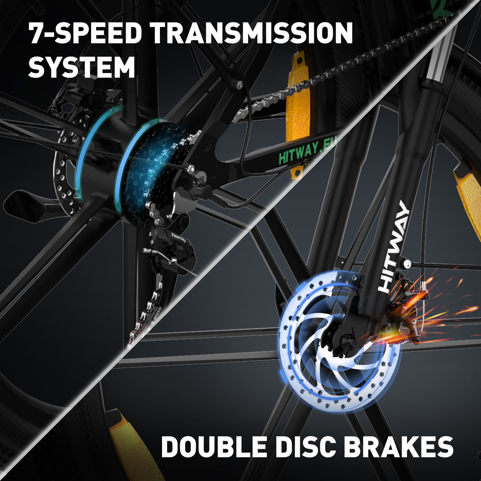 The HITWAY BK37 electric bike excels as a commuter bicycle with essential features. It includes dual disc brakes for reliable stopping power, a dual lighting system for night rides, Shimano 7-speed drivetrain for effortless pedaling, a rear rack for carrying gear, and fenders for mud protection. Equipped with a sleek LCD for real-time ride information and a mid-step frame for stability and easy mounting, it combines practicality with a stylish design.