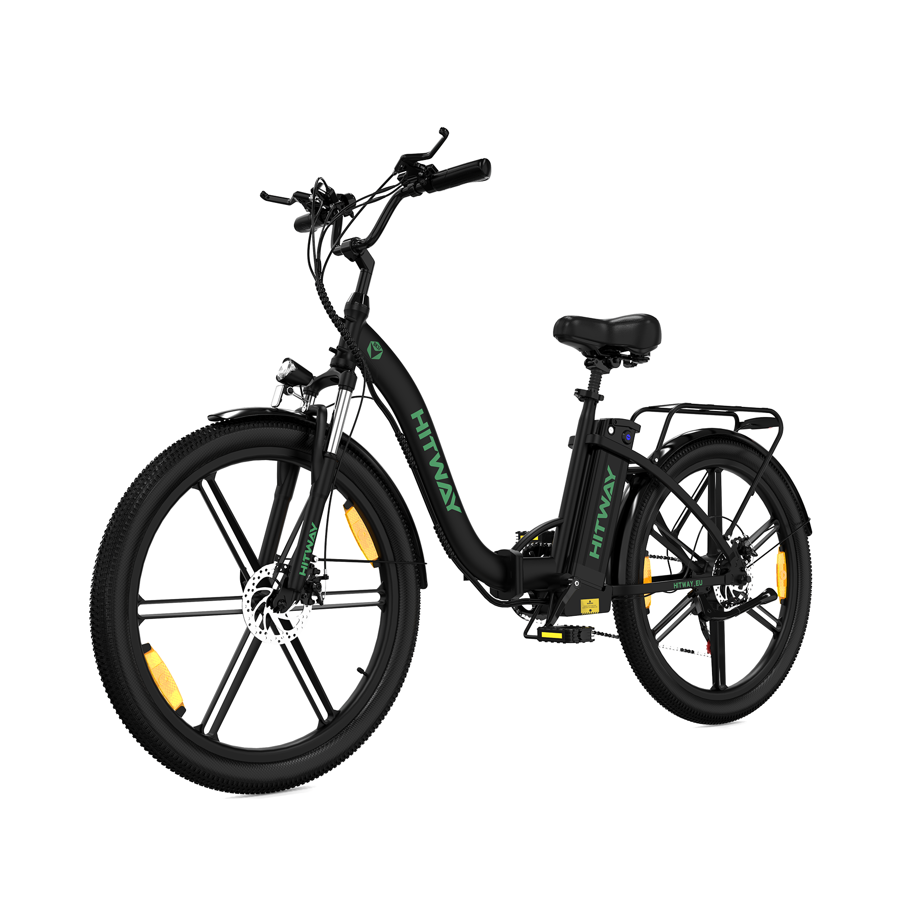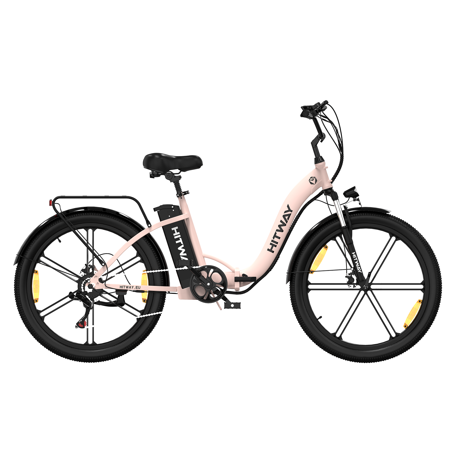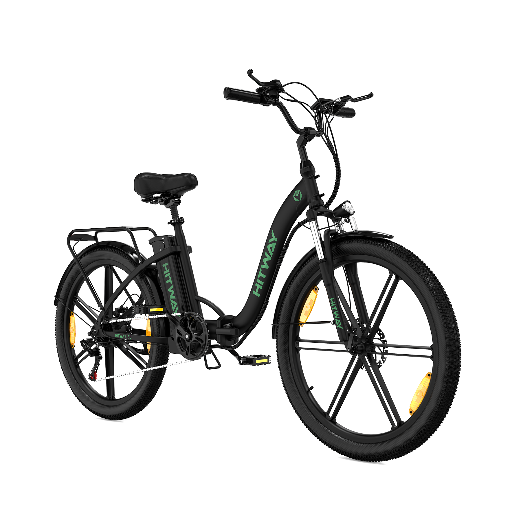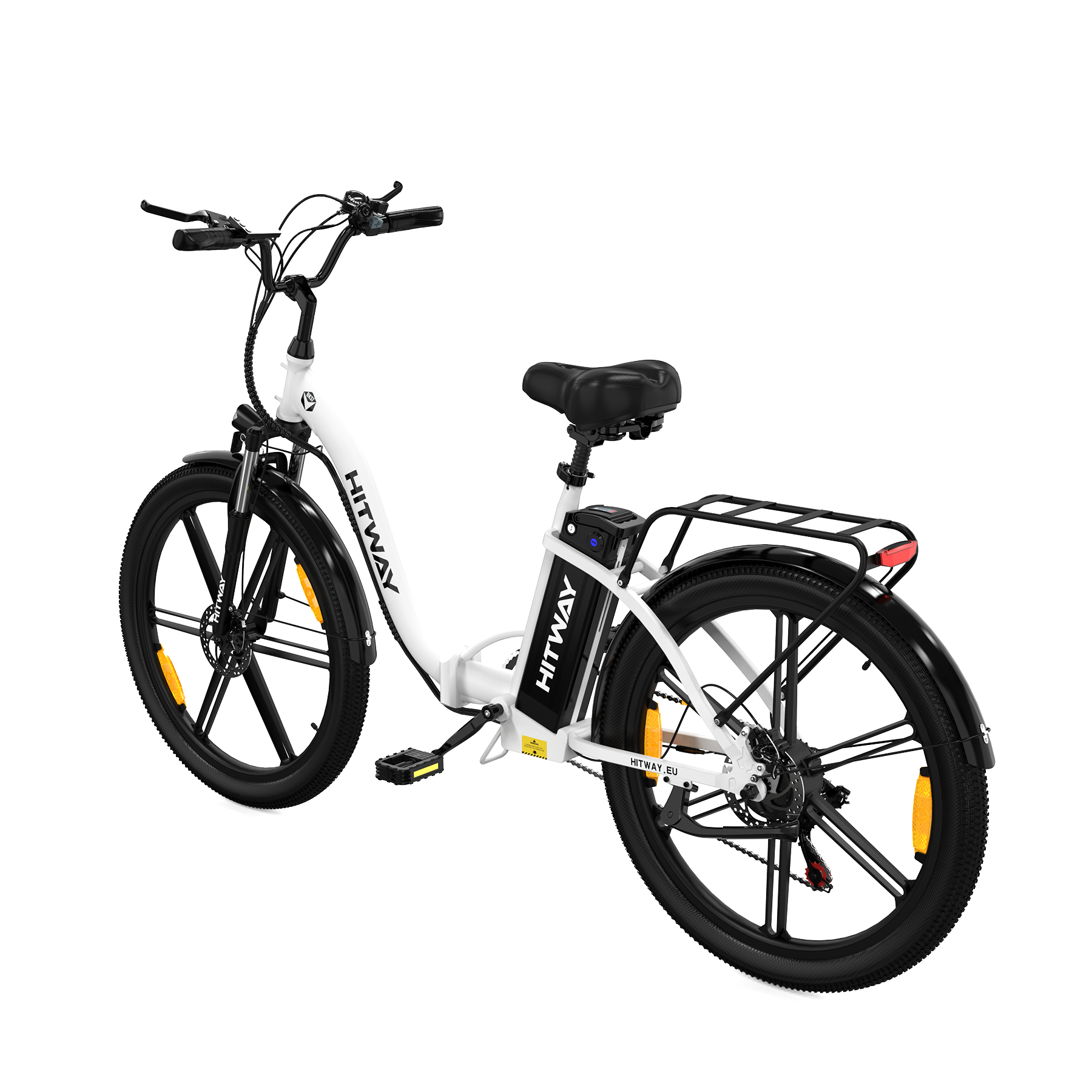 The HITWAY BK37 electric bike excels as a commuter bicycle with essential features. It includes dual disc brakes for reliable stopping power, a dual lighting system for night rides, Shimano 7-speed drivetrain for effortless pedaling, a rear rack for carrying gear, and fenders for mud protection. Equipped with a sleek LCD for real-time ride information and a mid-step frame for stability and easy mounting, it combines practicality with a stylish design.