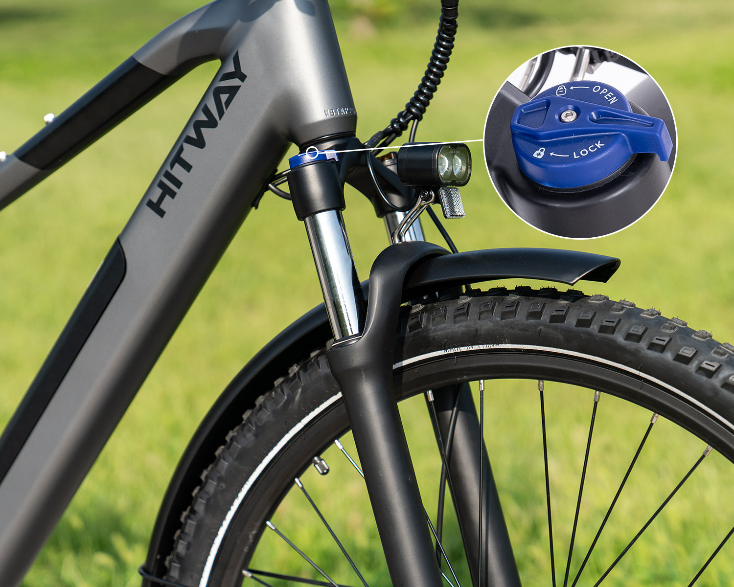 Conquer bumps, gravel, and uneven paths with a lockable front fork suspension that absorbs shocks and vibrations. Switch between soft and firm modes to suit your route — enjoy a smoother, more comfortable ride wherever your ebike takes you.