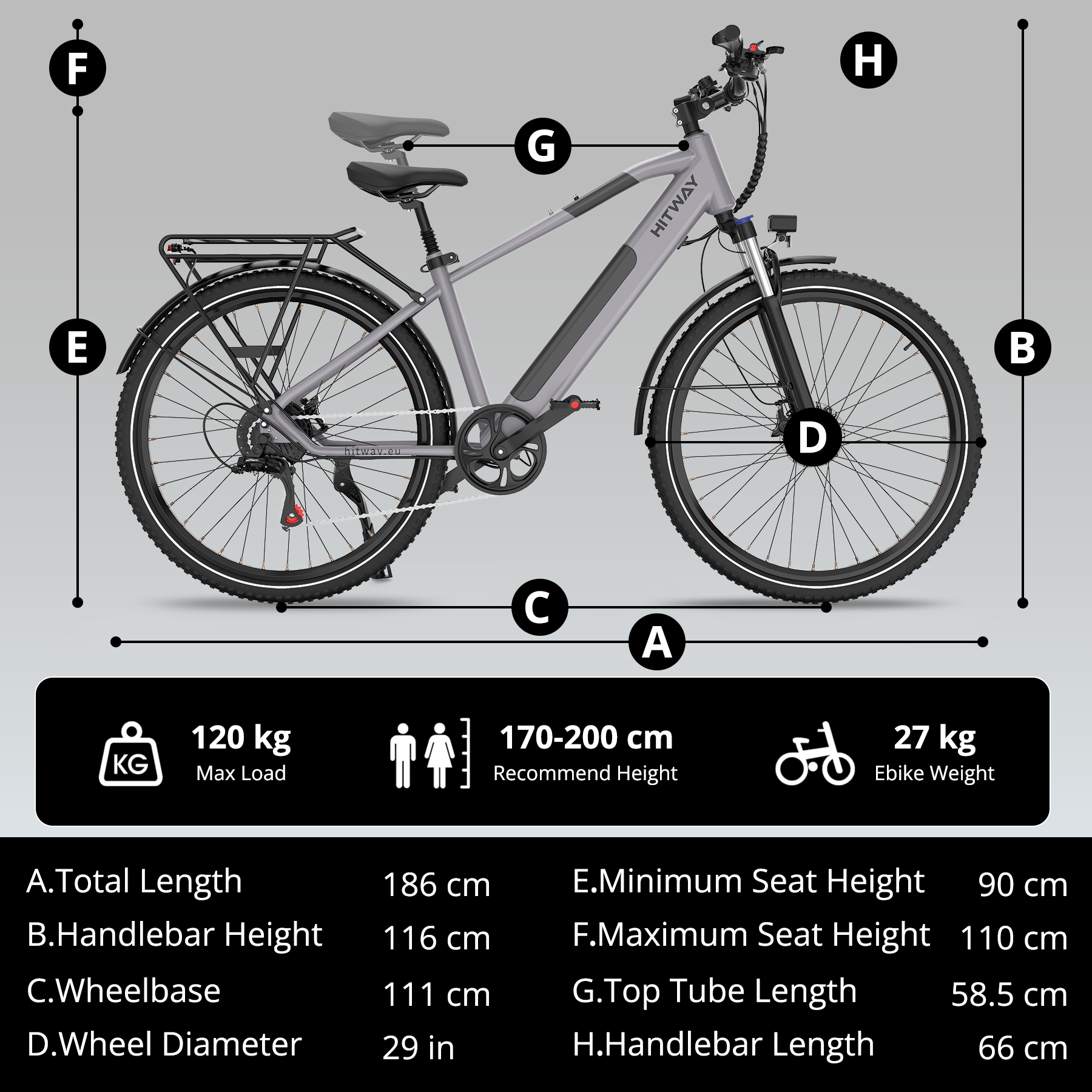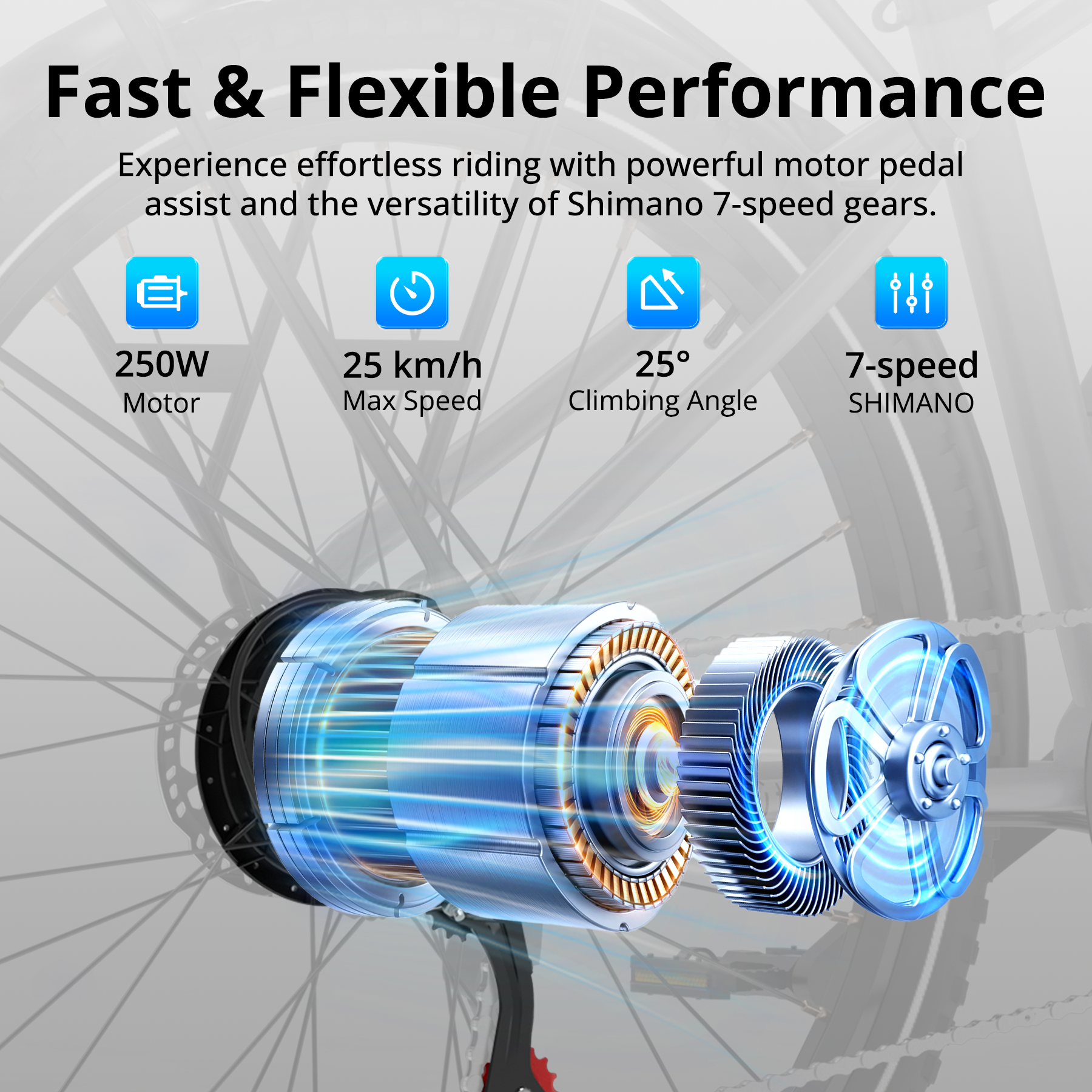 Equipped with a reliable 250W motor, this HITWAY ebike reaches speeds of up to 25 km/h and easily handles 25° slopes, delivering both smooth city commuting and confident mountain performance. The SHIMANO 7-speed gear system ensures flexible shifting for different terrains.