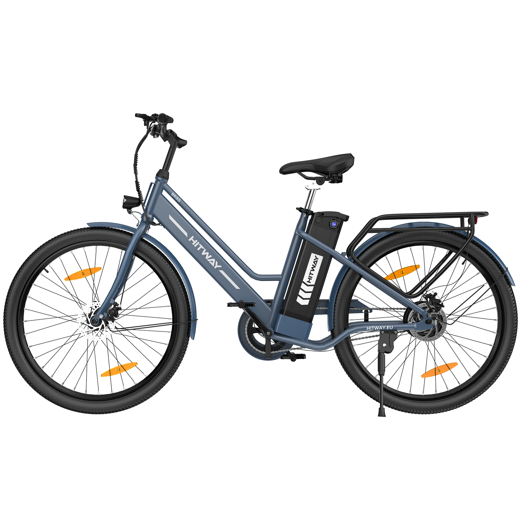 Step-thru frame for easy mounting. Rear rack to carry your gear.