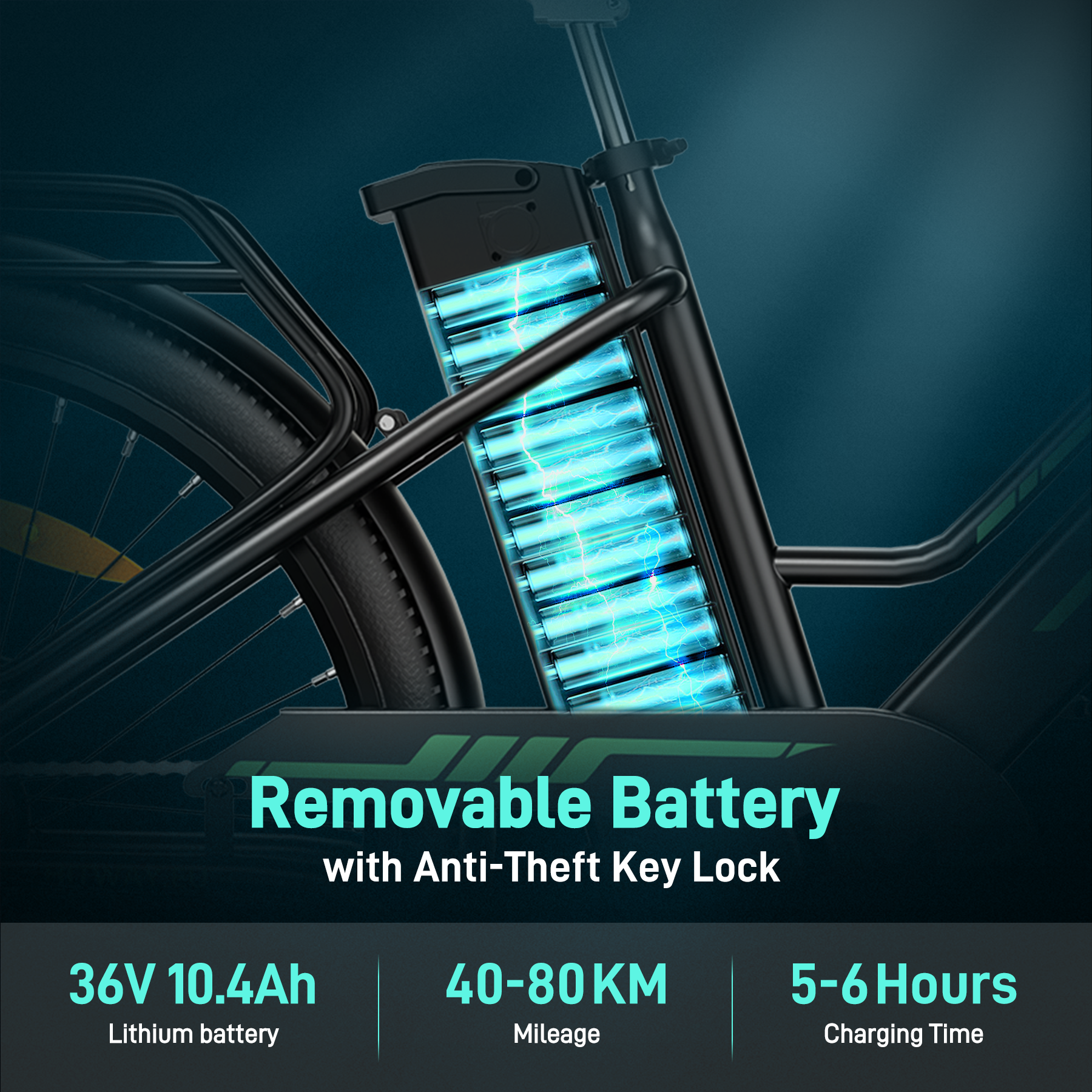 The BK8S 36V 10.4Ah battery is located under the seat, designed for easy access and removal with a foldable saddle. With built-in anti-theft protection, this battery is ideal for short-distance commutes, offering peace of mind and practical energy for everyday rides.